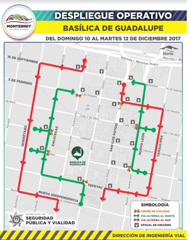 El Municipio de Monterrey, encabezado por el Alcalde Adrián de la Garza Santos, anuncia a través de la Secretaría de Seguridad Pública y Vialidad, que a partir de éste domingo 10 hasta el martes 12 de diciembre, se cerrarán algunas vialidades en calle aledañas a la Basílica de Guadalupe, esto con el fin de preservar la seguridad de los ciudadanos.