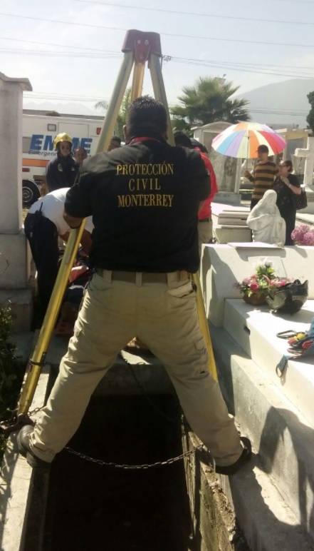 Elementos de Protección Civil de Monterrey, así como paramédicos de la Cruz Verde, auxiliaron a la mujer identificada como Lilia Paz Cavazos, quien cayó en la tumba alrededor de 14:00 horas en el panteón ubicado en Avenida Ruiz Cortines y Gonzalitos, al poniente de Monterrey.