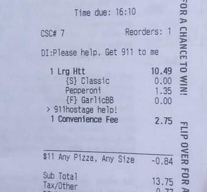 Cheryl Treadway pidió una y como ingrediente extra escribió «Hostage help!», por fortuna los empleados de Pizza Hut interpretaron el mensaje de la mujer y llamaron al 911 para reportar que había personas secuestradas.