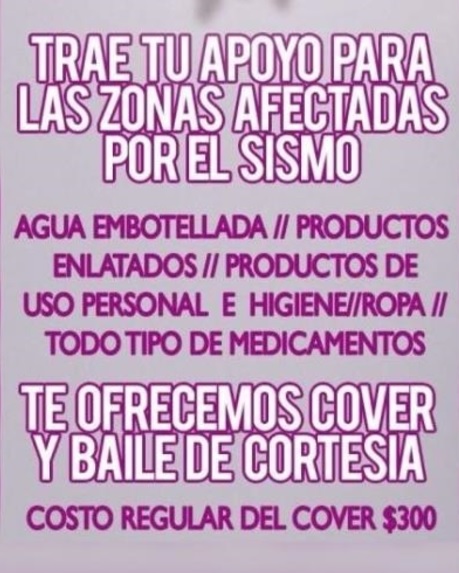 Con la única idea de ayudar a los damnificados del sismo del pasado martes, un table dance en Monterrey, Nuevo León, ofrece cover gratis y un baile de cortesía, a cambio de víveres.