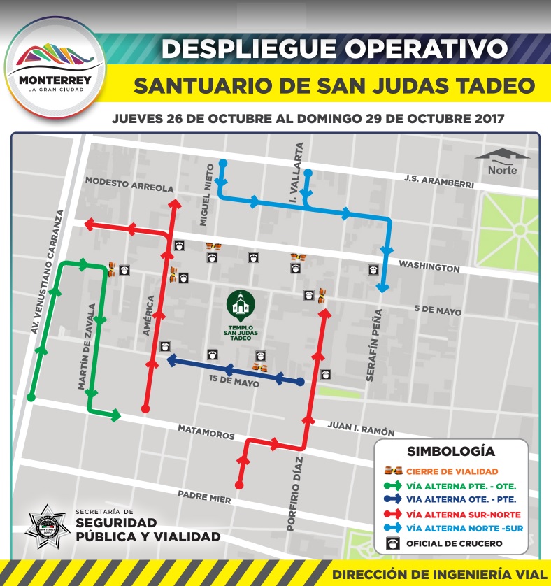 El Municipio de Monterrey, encabezdo por el Alcalde Adrián de la Garza Santos, mediante la Secretaría de Seguridad Pública y Vialidad, implementará un operativo de tránsito del 26 al 29 de octubre, en los alrededores de la Parroquia de San Judas Tadeo con motivo de las fiestas patronales.