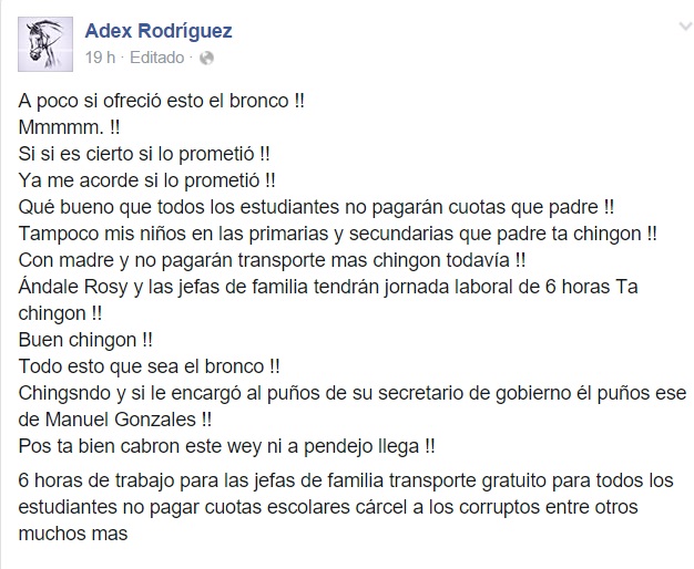 Pero lo que sí a muchos nos ha dejado con los ojos cuadrados es ver a Adex Rodríguez el propio hermano de Jaime Rodríguez criticándolo y exigiéndole que cumpla sus promesas de campaña, Adex ha estado activamente en las redes sociales tratando de concientizar a todos aquellos que los apoyaron en campaña para que le recuerden a Jaime de dónde proviene y todas sus promesas.