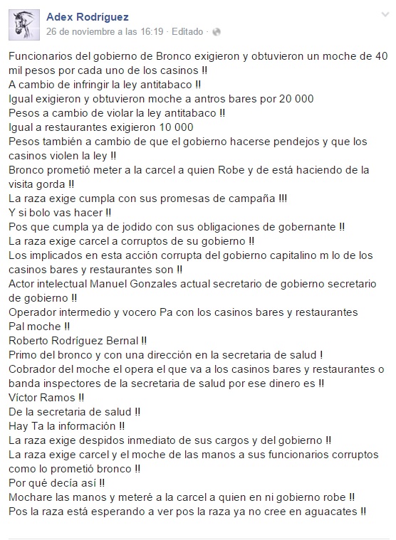 Algunos han criticado a Adex Rodríguez porque dicen que no le tocó “hueso” en el Gobierno de Jaime, pero es obvio que él mismo sabía que no podría participar en la administración “bronca”, lo que he leído en su página de Facebook es que su hermano se rodeó de personas que solo ven sus propios beneficios, al que Adex trae de entre ceja y ceja es al Secretario de Gobierno, a Manuel González, no lo baja de “puños” un término muy despreciativo, y al cual acusa de ser el responsable de operar los “moches” en los casinos, bares, antros y restaurantes a cambio de que puedan violar la Ley Antitabaco.
