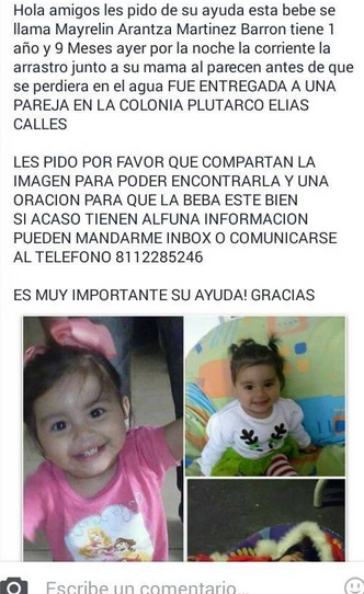 La búsqueda se realiza a la altura de Paseo Santa Rosa, Apodaca donde elementos de rescate se han sumado al rescate de la menor, sin embargo familiares de Mayrelin Martínez piden en redes sociales informes de la bebé, ya que según testimonios, ésta fue entregada a una pareja por su madre Leyda Lizeth para salvar su vida.