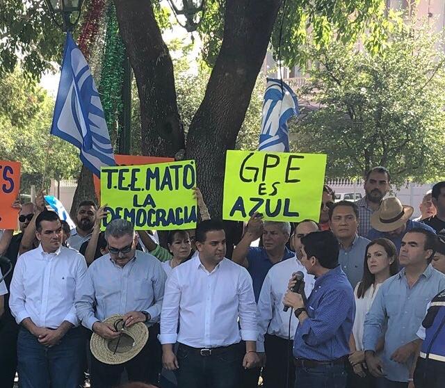 Esta mañana se reunieron un grupo de panistas en el Palacio de Cristal para protestar por la decisión del Tribunal Electoral del Estado de retirarles las constancias de mayoría a los ex Alcaldes Electos, Pedro Garza y Felipe Cantú.