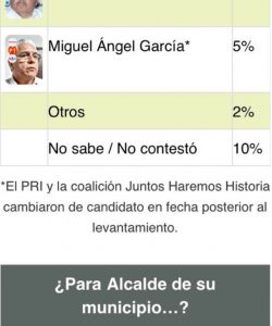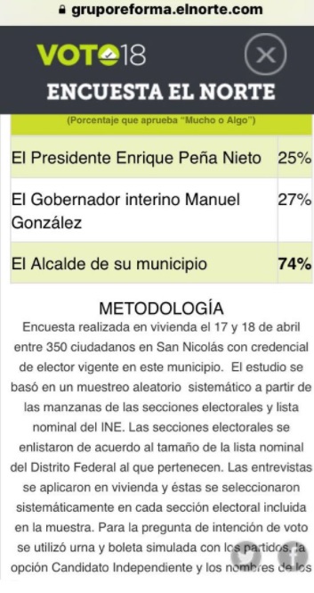 El día de hoy el periódico local El Norte publicó una encuesta de los candidatos que compiten por el municipio de San Nicolás de los Garza, llama mucho la atención los personajes seleccionados por el medio, por lo que nos lleva a dudar de la veracidad de ésta encuesta, y es que tiene dos pequeñas imprecisiones, una, que el candidato del PRI ya no es Víctor David Guerrero, dos, el candidato de MORENA nunca fue Miguel Ángel García, a pesar que éstos dos personajes fueran marcados con un asterisco para aclarar más abajo de la encuesta que cambiaron de candidatos, “*El PRI y la coalición Juntos Haremos Historia cambiaron de candidato en fecha posterior al levantamiento” la verdad veo una mala fe por parte del periódico, ya que deja en desventaja a los dos actuales candidatos del PRI y MORENA, la posibilidad de que Miguel Ángel García fuera candidato de MORENA para San Nicolás fue solo en rumores, ya que su actual candidato Mario Cantú siempre estuvo nombrado como tal, jamás ni por un día Miguel Ángel estuvo al frente de ésta candidatura, por el lado del PRI, efectivamente sÍ hubo un cambio de última hora, el pasado 20 de abril VÍctor David fue bajado por la dirigencia del Partido argumentado la paridad de género en las candidaturas, y darle paso a Verónica Cantú, ojo, chequen la fecha en que se realizó la encuesta de El Norte, fue entre el 17 y 18 de abril, ¿dos días para realizar ésta encuesta?, bueno, si se tardaron solo dos días, por qué no haber hecho una encuesta actualizada, y por qué publicar una encuesta donde el segundo y tercer lugar están completamente alejados de la realidad.