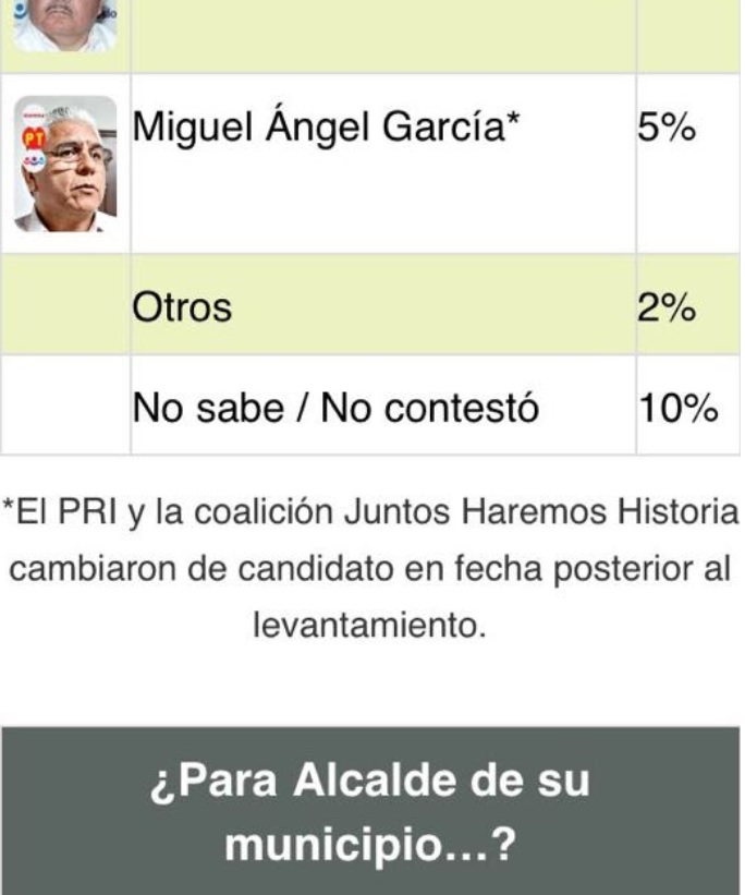 Ósea, son 7 candidatos, en primer lugar aparece el panista Zeferino Salgado, en segundo aparece Miguel Ángel García (FAKE NEWS) en tercero Víctor Guerrero (FAKE NEWS) en cuarto, Josefina Villarreal, en quinto, Camilo Cantú, en sexto, Ricardo Iván Yáñez, en séptimo Gustavo Cerrillo, digo, El Norte tiene la capacidad técnica y económica para haber realizado una nueva encuesta, caray son 10 días en las que se tuvo la posibilidad de actualizarla, y ésto solo en el caso de Víctor David Guerrero, que fue sacado de la contienda, pero en donde si se ve una falta de profesionalismo fue en la del candidato de MORENA, ya que éste siempre tuvo el nombramiento oficial del partido de Andrés Manuel López Obrador.
