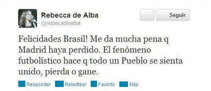 Rebeca de Alba tuiteó después del juego entre los equipos de fútbol de Brasil y España, lo siguiente: