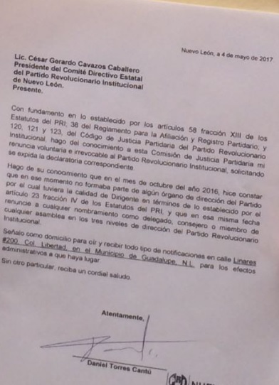 Con un escrito dirigido al presidente del PRI en Nuevo León, César Cavazos, el Diputado Daniel Torres Cantú, presenta su renuncia voluntaria al PRI.
