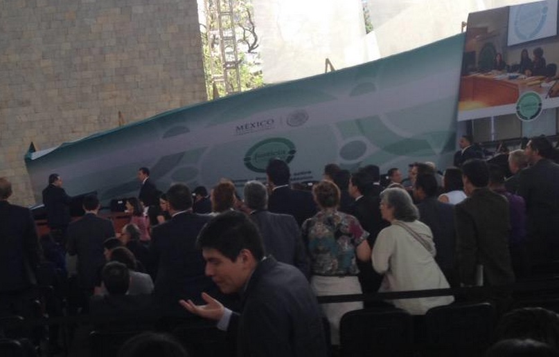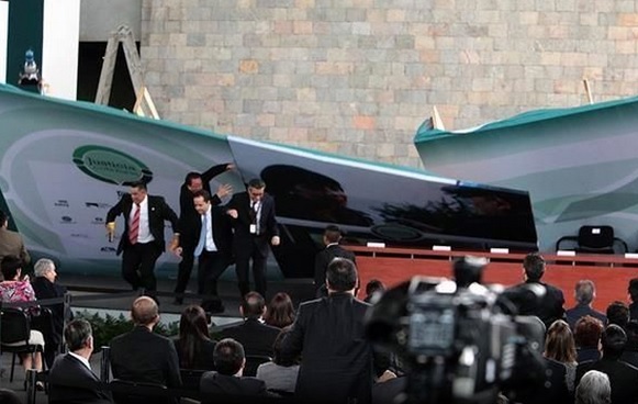 Gran susto sufrieron los presentes en el acto Justicia Ciudadana, que se realizaba en el patio del Museo de Antropología, ya que momentos antes de que se hiciera presente el Presidente de México, Enrique Peña Nieto, la mampara principal se cayó sorpresivamente.