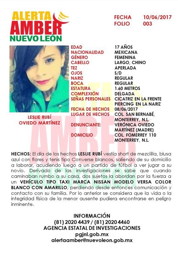 La Procuraduría General de Justicia de Nuevo León, emitió una Alerta Amber para tratar de localizar a Leslie Rubí Oviedo Martínez de 17 años, quien de acuerdo a testigos, ésta fue subida a la fuerza a un taxi Nissan Versa en color blanco.