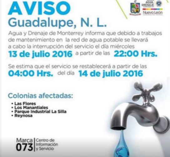 Realizarán corte de agua en colonias de Guadalupe