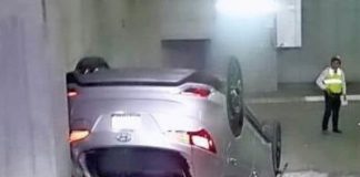 Matrimonio vuelca su camioneta en estacionamiento de Plaza Esfera