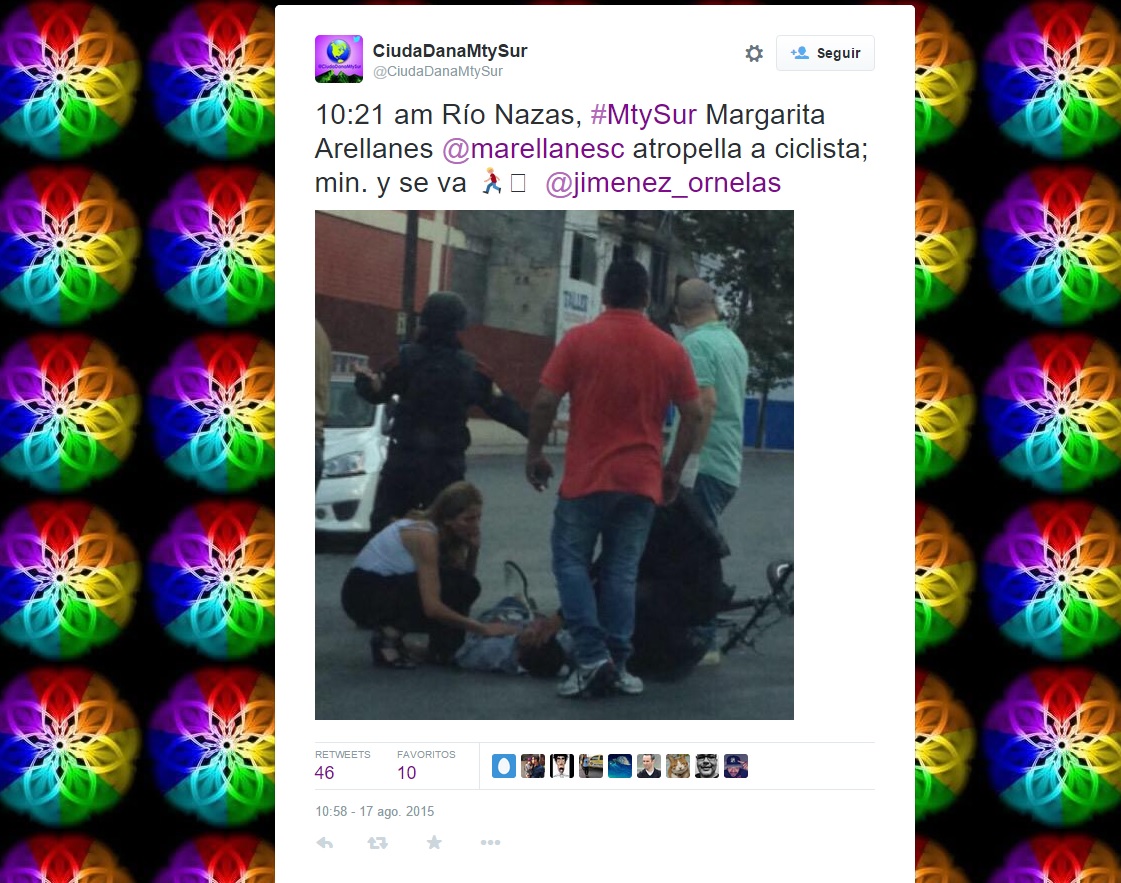 El día de ayer la Alcaldesa de Monterrey, Margarita Arellanes Cervantes, mientras circulaba por la Avenida Río Nazas, en la ciudad de Monterrey, vio a un ciclista atropellado, por tal motivo pidió a su chofer detener la marcha para luego bajar de su camioneta y tratar de brindar auxilio al hombre herido.