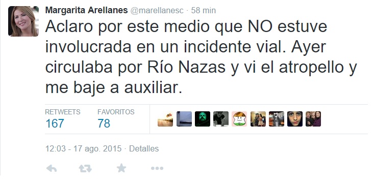Por su parte la Alcaldesa regia, por la misma red social de Twitter, aclaró que ella pasaba por el lugar y que no estuvo involucrada en ningún percance vial, como lo afirmó la tuitera irresponsablemente y de manera difamatoria: