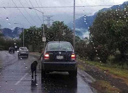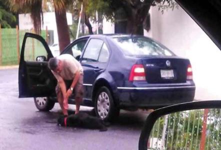 En unas imágenes que circulan en las redes sociales se ve que un sujeto, que al mismo tiempo conduce un automóvil de color azul marino con placas SRD 69-09, trae agarrado de la correa a un perro de color negro, al parecer la intención del conductor era cansar al pobre animal para después abandonarlo, lo cual le salió mal ya que terminó atropellando al desdichado perrito.