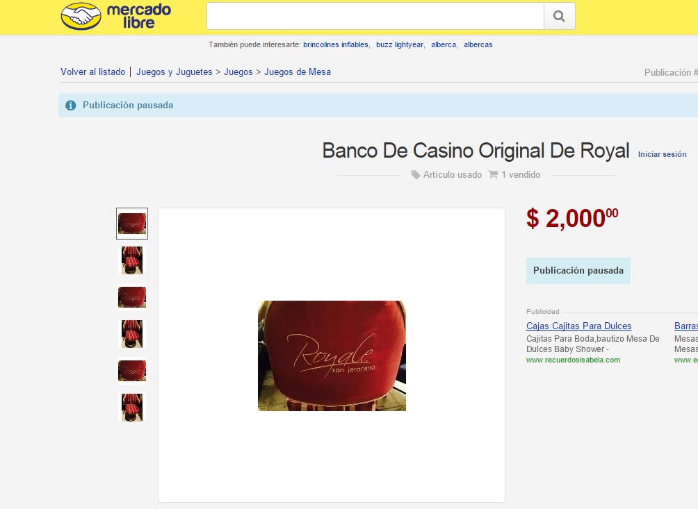 El artículo que estaba a la venta en Mercado Libre, se ofrecía bajo la leyenda de: «Banco del casino original del Royale«, mismo que se ofreció como usado, a las pocas horas de haberse ofertado por un vendedor desconocido que se encuentra en Monterrey, éste ya fue vendido por el precio de 2 mil pesos.