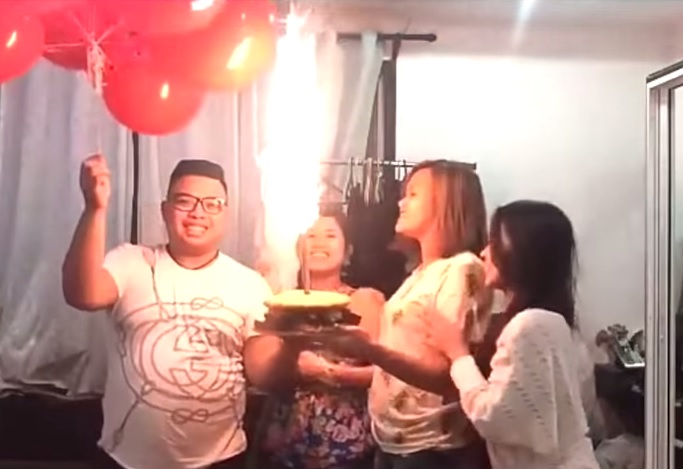 El joven traía unos globos inflados con helio y junto a él un pastel con una vela prendida, mientras sus amigas le rompían huevos en la cabeza, al descuidarse casi causa un grave incendio.