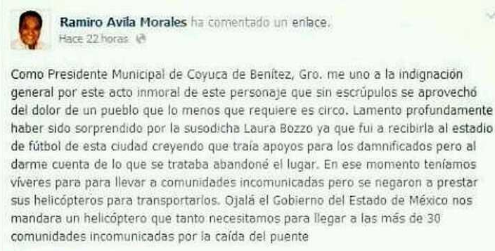 Pero la reacción del pueblo mexicano no es en apoyo a “la señorita Laura” como ella lo menciona en sus declaraciones, ya que el Alcalde de Coyuca de Benítez, Ramiro Ávila Morales que la visita de Bozzo era inmoral y que no tenía escrúpulos, ya que le habían pedido el helicóptero para transportar víveres a comunidades incomunicadas, a lo que la conductora se negó ya que dijo que era para su uso y que tenía que grabar.