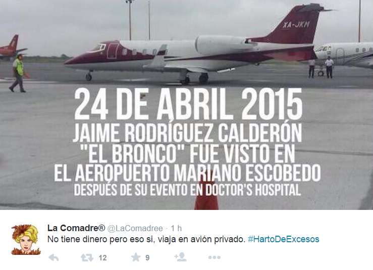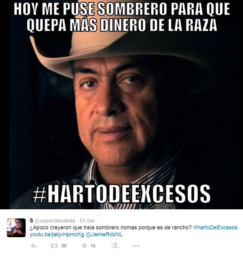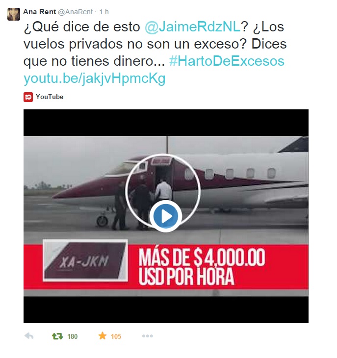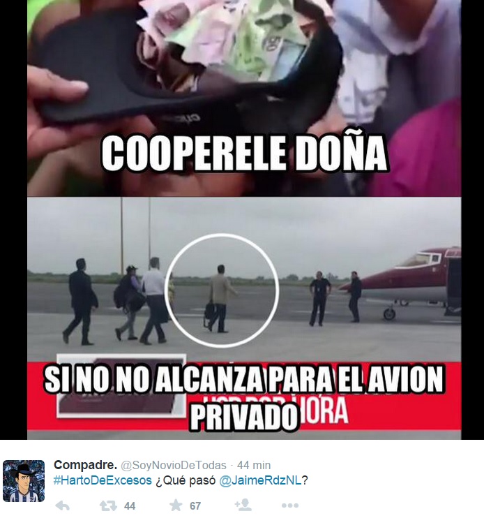 Con el hashtag #HartoDeExcesos usuarios de Twitter cuestionan a Jaime Rodríguez del por qué dice no tener dinero para financiar su campaña y viaja en jet privado.